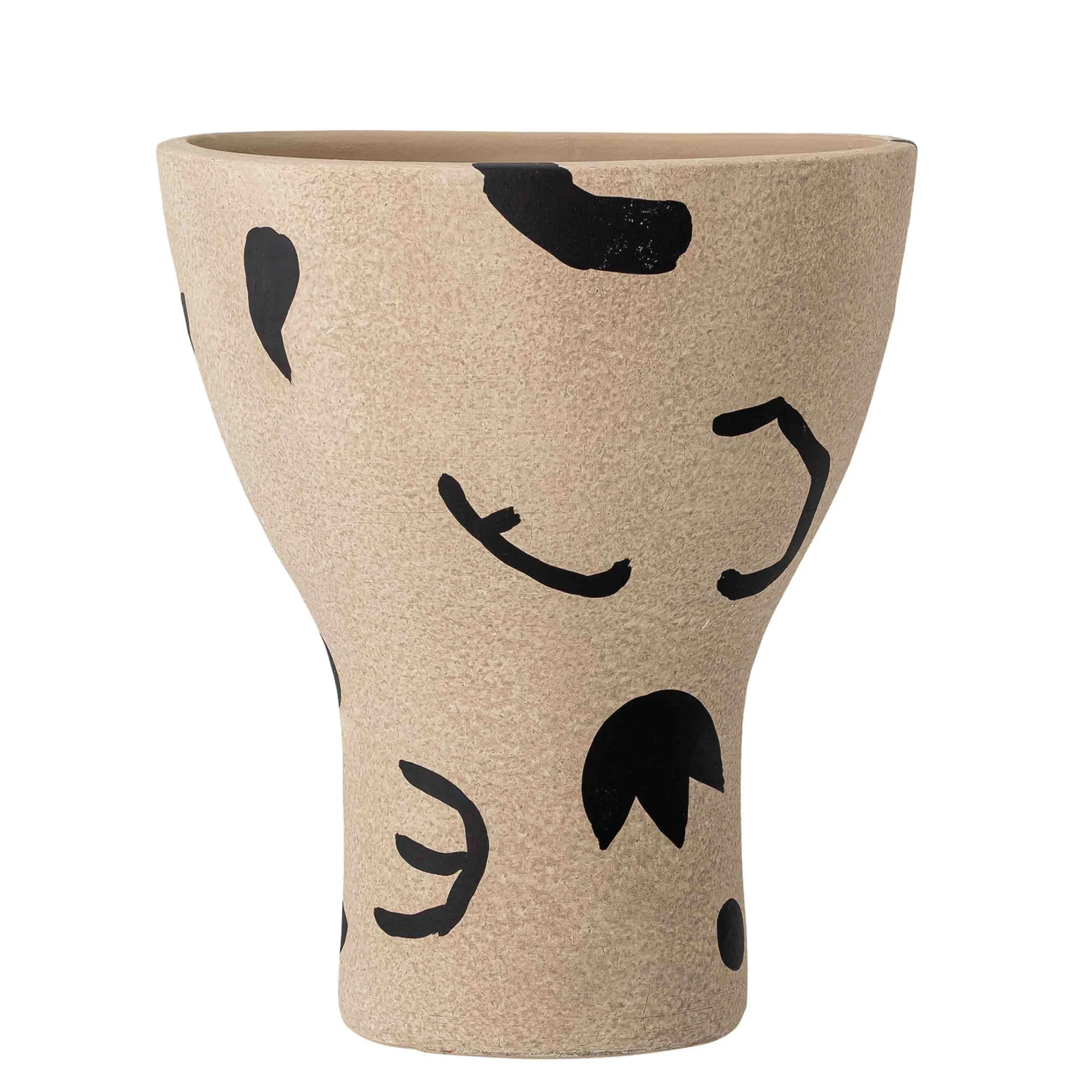 Diese Dekovase ist aus braunem Terracotta und in einer schlichten, weichen, becherartigen Form mit einer breiten Öffnung oben. Neben der natürlichen Farbvariation und Textur von Terracotta wurde diese Vase mit kleinen, schwarzen, grafischen Malereien von Hand verziert, die jede Vase einzigartig machen. Eine schöne Dekoration für den Tisch, die Fensterbank oder die Kommode.