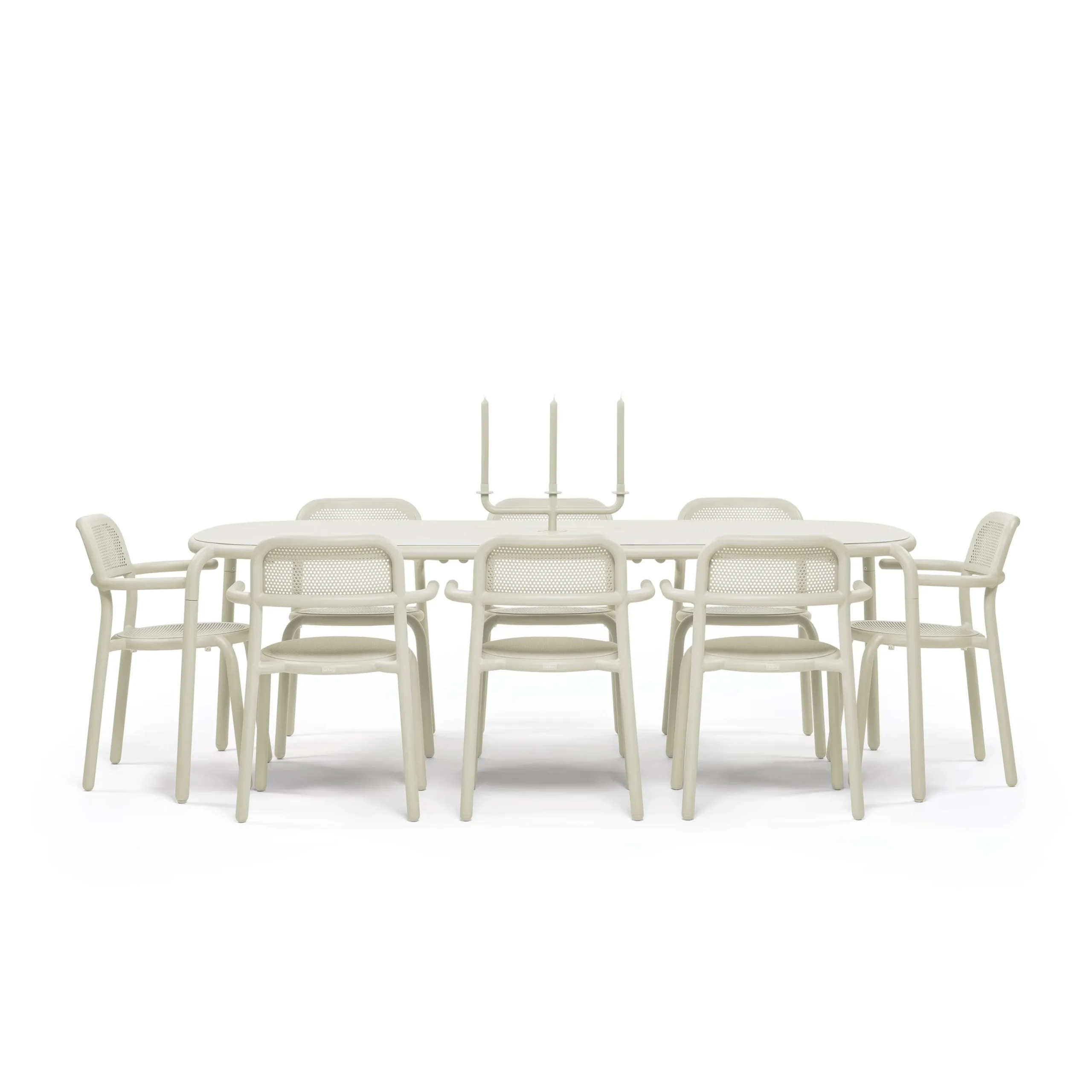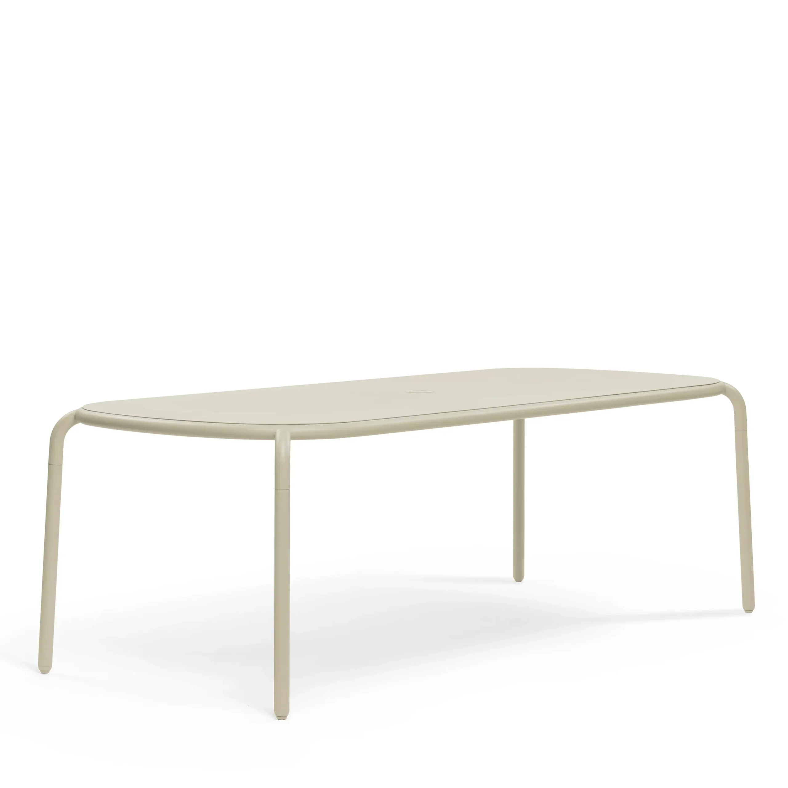 Möchten Sie ein entspanntes Abendessen im Freien mit Ihrer Familie und Ihren Freunden genießen? Klingt, als könnte Toní Tablo Ihnen dabei helfen. Bei einer Länge von 2,2 Metern bietet der Tisch bis zu 8 Personen Platz. Das Aluminiummaterial lässt den Tisch schön leicht sein, sodass Sie ihn mühelos bewegen können. Das Loch in der Mitte dient tagsüber als Schirmhalter und kann nachts für den 3-armigen Toní-Kerzenhalter verwendet werden. Toní ist ein echter Gewinner.Der Toní Tablo ist leicht zu pflegen und da er mit der hochwertigsten Außenbeschichtung behandelt wurde, ist der Tisch rostfrei, wetterfest und farbecht.