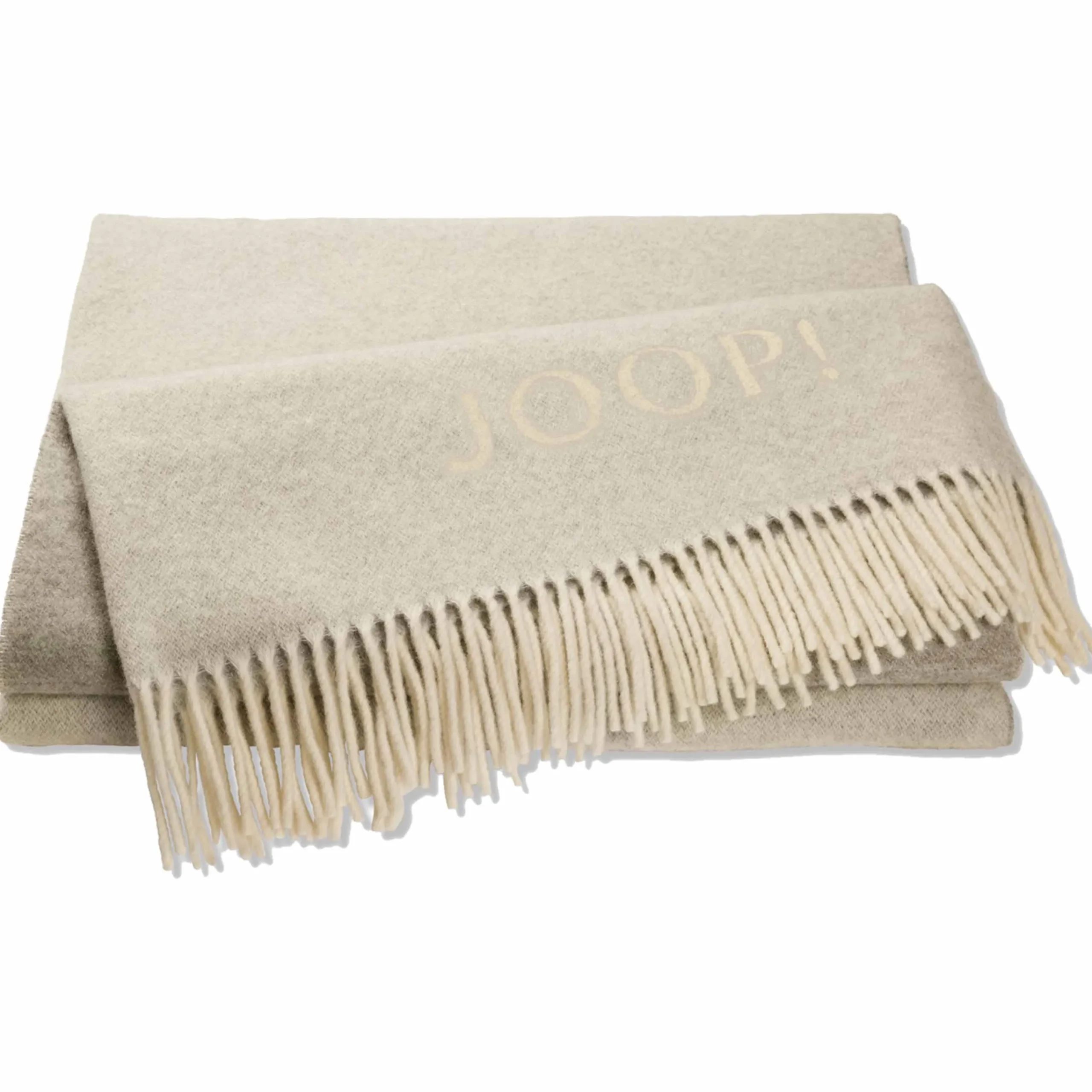 Hochwertig, designorientiert, exklusiv das zweifarbige Fransenplaid JOOP! FINE-DOUBLEFACE ist wunderbar leicht und wärmt angenehm durch den edlen Materialmix aus Wolle und Kaschmir. Auf der cremefarbenen Vorderseite ist der JOOP!-Schriftzug dezent eingewebt. Die feinen Fransen sind wie die Abseite naturfarben und bilden dadurch einen eleganten Kontrast.